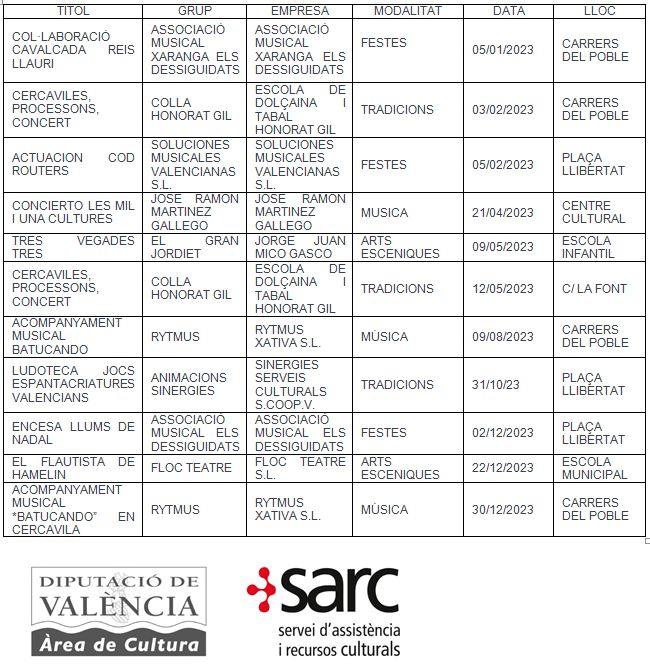 L’Ajuntament de Llaurí ha realitzat i va a realitzar, durant l’any 2023, les activitats detallades a continuació i han estat patrocinades i subvencionades per la Diputació de València dins el seu programa SARC – Servei d’assistència i recursos culturals, área de cultura.