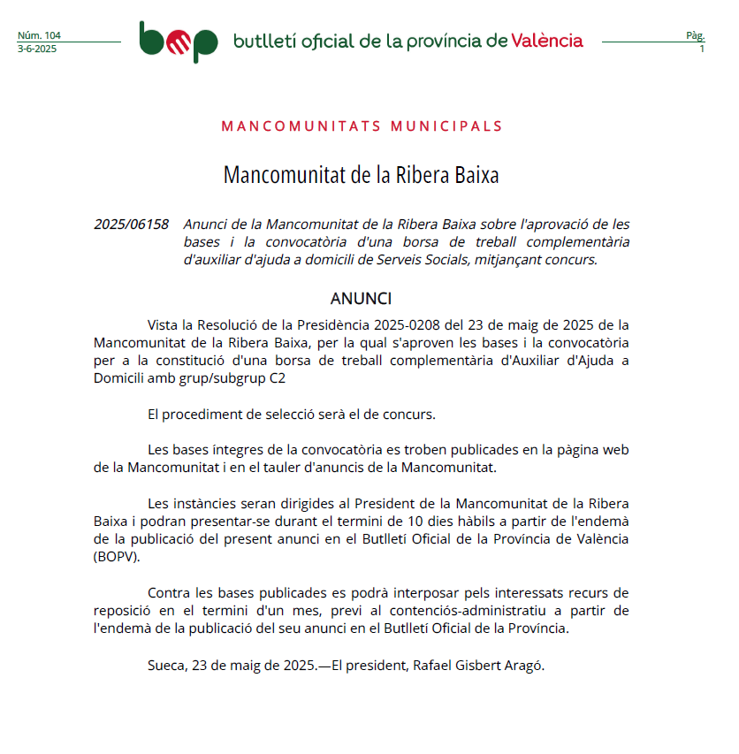 MANCOMUNITAT DE LA RIBERA BAIXA CONVOCATORIA BOLSA DE TRABAJO DE AUXILIAR AYUDA A DOMICILIO