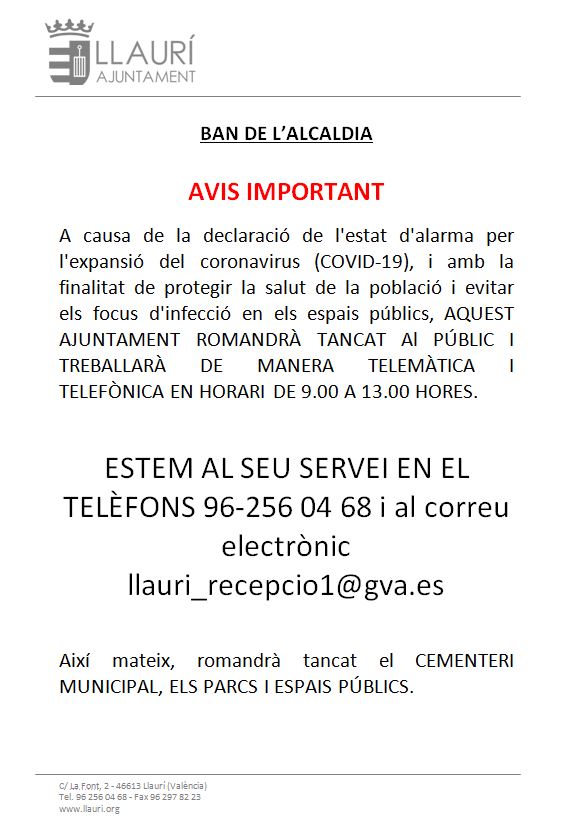 BAN DE L’ALCALDIA PER LA SITUACIÓ CREADA PEL CORONAVIRUS marzo 16, 2020 Anuncios, Bandos, General Twitter Facebook Google+ Pinterest LinkedIn Tumblr Email